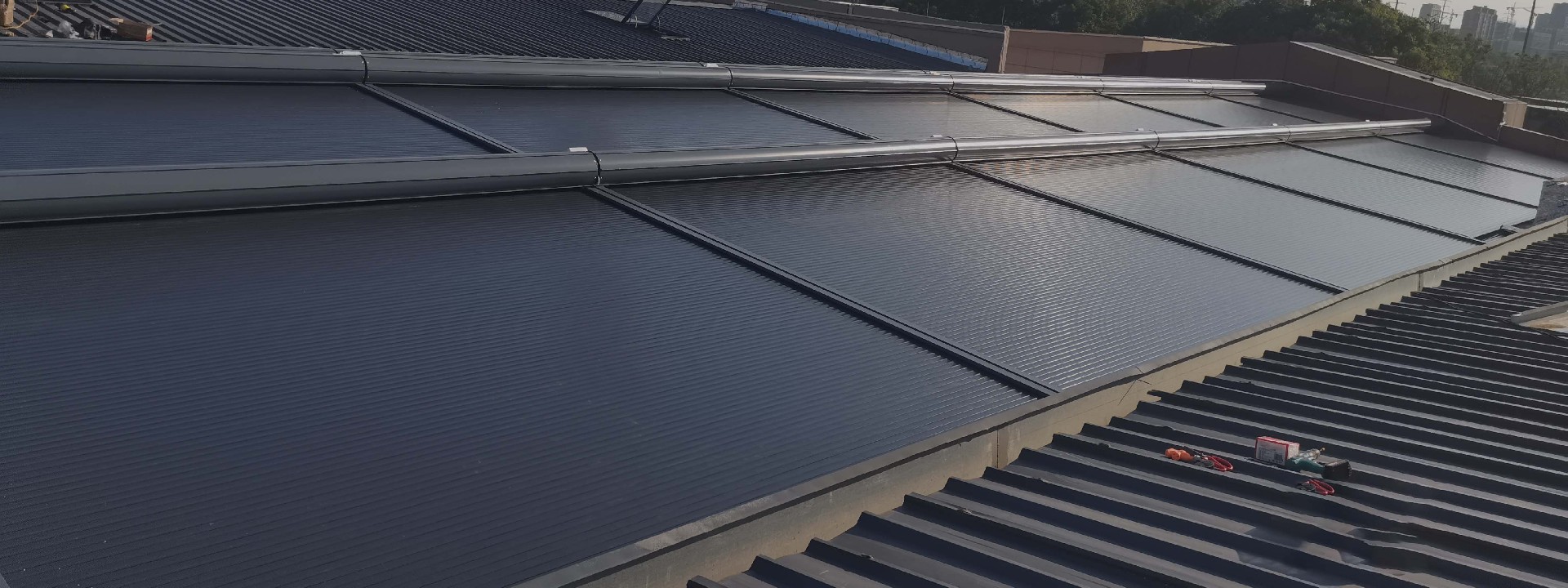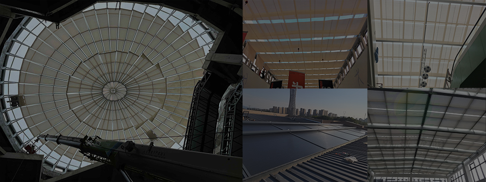 卷軸式方案,面料運(yùn)行方向與原有結(jié)構(gòu)貼合度高,最大程度保持原有屋面結(jié)構(gòu)美觀(guān)